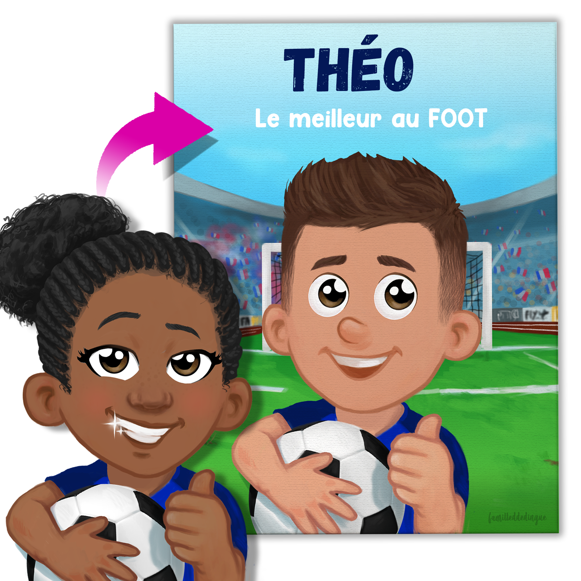 Transformez votre passion pour le foot en une œuvre d'art unique avec notre toile personnalisée XXL. Que votre enfant soit un joueur passionné ou un fervent supporter, Famille de Dingue vous permet de créer un avatar qui reflète parfaitement l'amour pour ce sport.